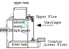 我々は、水の流れと音の流れを関連・結合させたシステムを構築するため、「流れている水」をインタフェースに特定した。特に日常の中で触れる機会の多い蛇口から流れる水に注目し、上部流量と下部流量のセンシングを行うことで、それらの流量の変化、差分をユーザの入力行動判別することとした。また、それに加えユーザの気配、存在の検出のために赤外線センサと光センサを用いた。