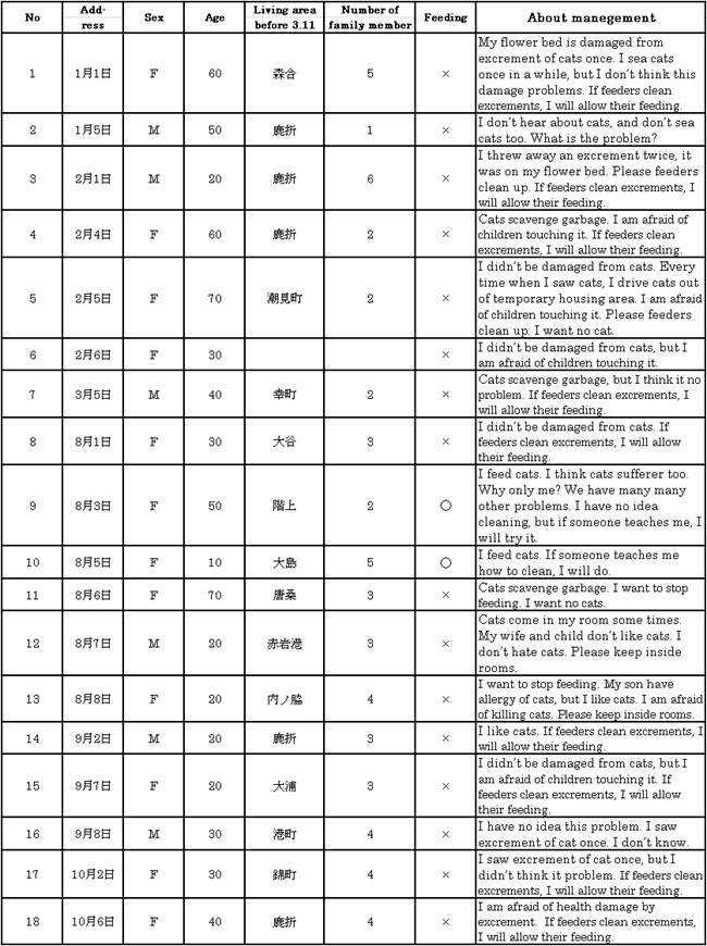 Free roaming cats may be the support of sufferer from disaster in temporary housing. However, some people, for example, who have allergy to cats or don’t like cats, may get away from the damage and stress of cats. I asked people living in temporary housing about cats. I want to know whether the problem of cats can be solved by management of cats. I researched in Kesennuma ground temporary housing of Kesennuma City. Cats who live in near this temporary housing leave their excrement in this temporary housing, and some people send complaints about smell of excrement and hygiene to block associations. I visit to 42 rooms of south area in this temporary housing. 18 households of 42 rooms answer my questions about cats. My questions had 3 point. @How problem this person damaged from cats? AIs this person feeder or not? BHow about management of cats? 3 households didn’t damage from cats, and 13 households damaged from cats (scavenging garbage: 2, about excrements: 10, both of them: 1). Feeders are 3 families, they didn’t damage from cats. Complains are concentrated in one of housing, address 8-X. Other housing people didn’t think this problem serious. I found the key for solving these problems. 9 households of 13damaged households said “If feeders clean excrements, I will allow their feeding”. In next stage, I teach management of cats and check the smell and stress level of people.
